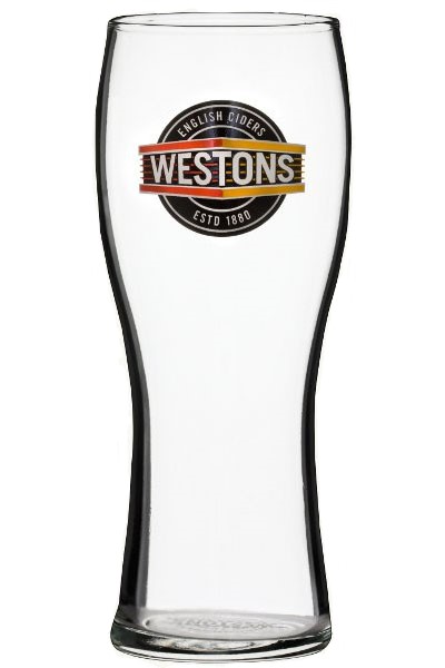 Weston's Apfelweinglas 50 cl. Wenn Sie einen traditionellen englischen Apfelwein auf die klassische Art trinken möchten. Das Weston-Logo befindet sich auf der Vorderseite des Glases. Das Glas selbst ist mit einer Einbuchtung versehen, die für zusätzlichen Halt sorgt.