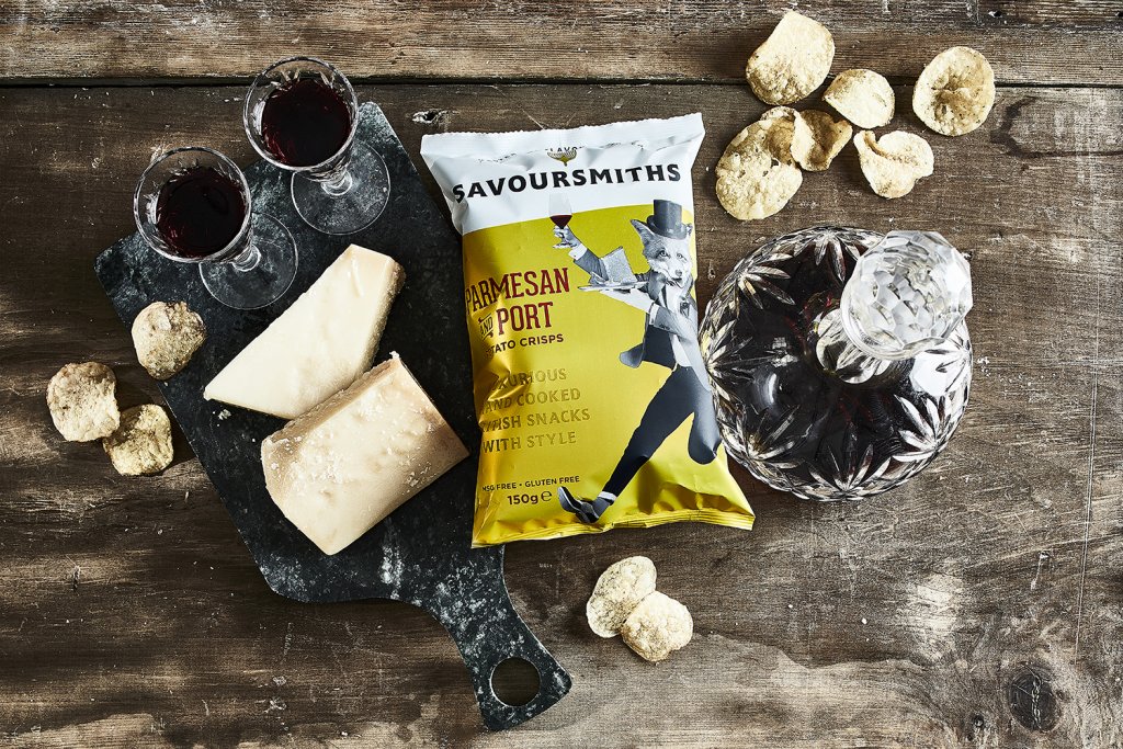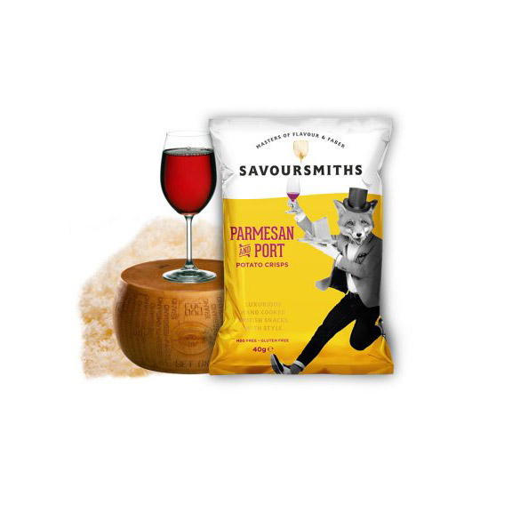 Savoursmiths chips - parmesan och portvin 40 g. Den runda, mjuka sötman från portvinet blandas med fyllig parmesanost och blir till en underbar smakkombination. Lyxiga ingredienser i ett snacksvänligt och krispigt format.