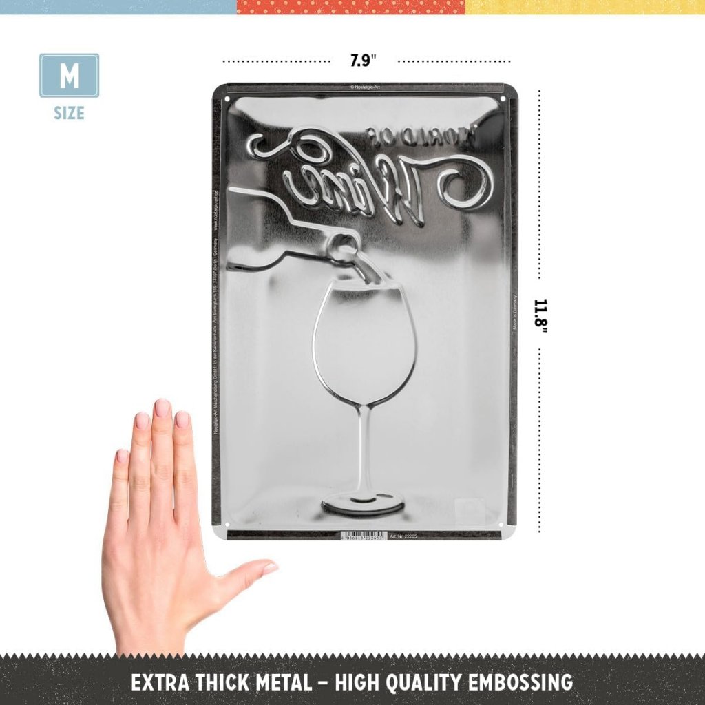 Perfekt für die Hausbar, den Weinkeller oder die Küche ist dieses Schild sowohl ein optisches Highlight als auch eine Hommage an die Vielfalt des Weins. Die robuste Metallkonstruktion mit patinierter Retro-Optik verleiht ihm einen charmanten Vintage-Look, während das informative Design es zu einem Gesprächsthema für jeden Weinliebhaber macht.