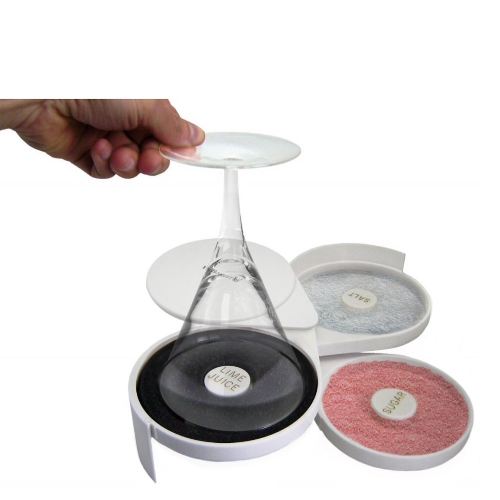 Glasrandbefeuchter weiß. Ein praktisches Gerät zum Befeuchten und Garnieren von Glasrändern. Z. B. für einen perfekten Salzrand für eine Margarita. Enthält drei Schalen für drei verschiedene Zutaten. Salz, Zucker und Zitrusfrüchte. Die Schale für Zitrussäfte hat am Boden einen Schwamm für eine gleichmäßigere Verteilung.