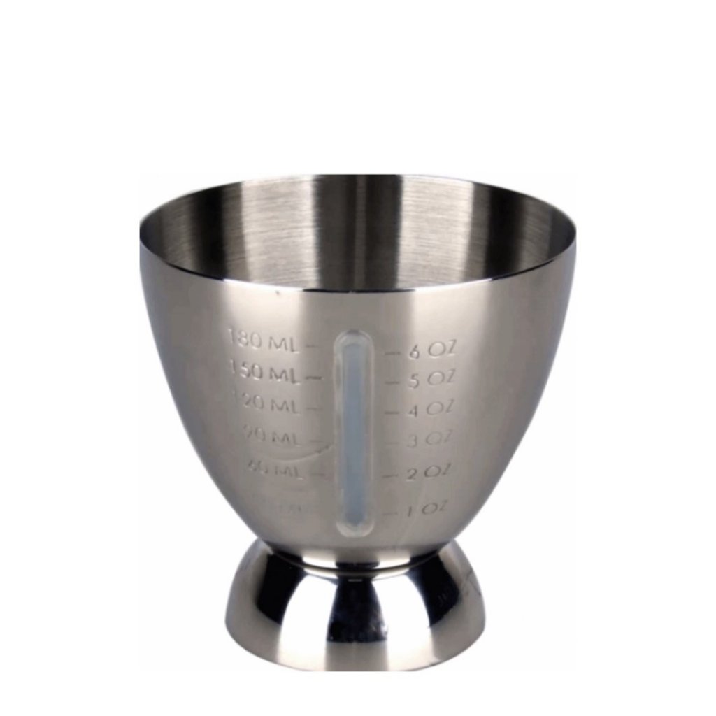 47 Ronin Jigger mit Markierungen außen im japanischen Stil. Eine andere Art von Jigger mit einem transparenten Maß an der Seite. Dank des transparenten Teils des Jiggers können Sie von außen leicht und genau sehen, wie viel Sie hinein füllen. Der untere Behälter fasst 30 ml und der obere bis zu 180 ml.