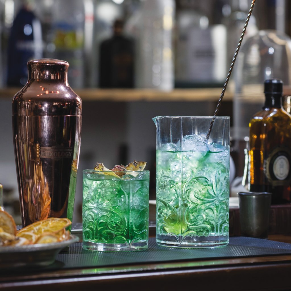 Schönes Rührglas mit Blumenmuster, das sich um den Glaskörper herum erstreckt. Das Tattoo Rührglas von RCR aus Italien ist ein sogenanntes Mixing Glass, das speziell zum Mischen von Getränken geeignet ist, die nicht geschüttelt werden sollen. An der Öffnung befindet sich ein praktischer Ausgießer zum einfachen Servieren. Ein stilvolles Rührglas mit einem zarten Muster, das jeder Cocktailbar Farbe verleiht.