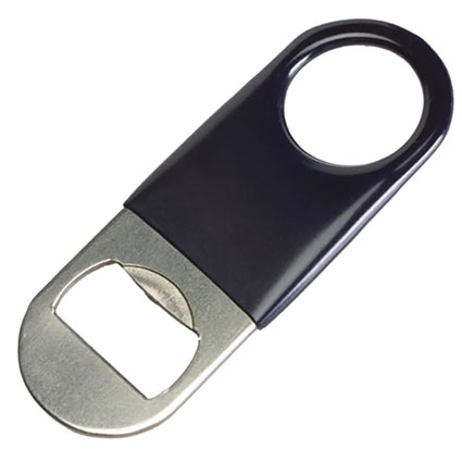 Mini Bar Blade Flaschenöffner schwarz. Einer der am häufigsten verwendeten Flaschenöffner in Restaurants. Eine flache Scheibe mit einem Öffner an einem Ende und einem Loch am anderen. Das Loch dient der einfachen Aufnahme von in Eis gelagerten Flaschen. Mini Bar Blade ist in einer Vielzahl von Farben erhältlich.