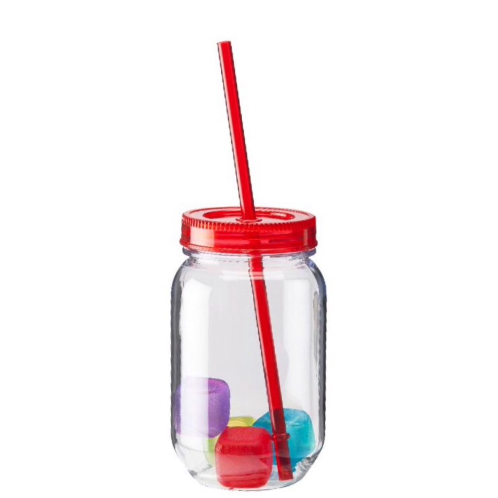 Mason Mug i plast med sugrör och iskuber - grönt lock. Detta plastglas är egentligen en burk med lock som designats för att servera drinkar ur. En elegant och modern presentation av cocktails eller longdrinks. Levereras med tillhörande lock, sugrör och 4 st iskuber i plast. Denna variant har ett rött lock.Volym: 50 cl