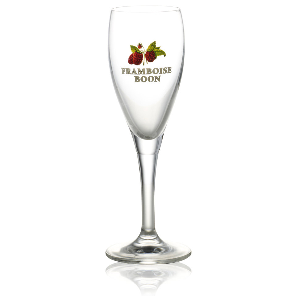 Dieses Bierglas hat die typische Form des Fruchtlambics, nämlich das „Flute Glass“. Ein schmaler Kelch mit einem schlanken und eleganten Fuß. Auf der Vorderseite ist Framboise Boon aufgedruckt, und darüber schweben kleine Himbeeren.