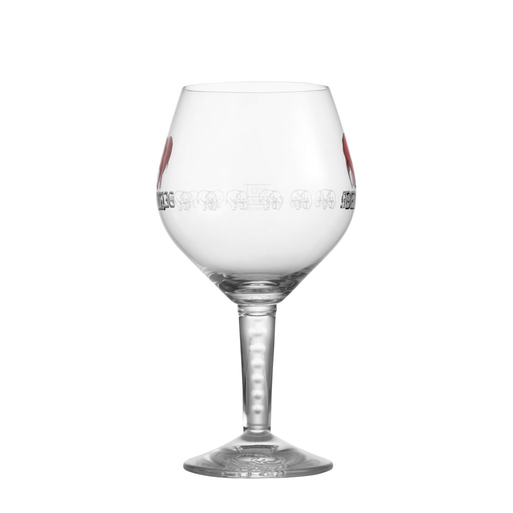 Ein Bierglas mit vielen Details. Das Delirium Bierglas hat einen exquisit gestalteten, geräumigen Bierkelch, der auf einem stabilen Fuß und Stiel ruht. Der Stiel ist abgeschrägt und an einer Seite mit Einkerbungen versehen, um das Glas gut greifen zu können. Die Unterseite des Fußes ist mit dem Elefanten von Delirium verziert. Beide Seiten des Glases sind mit dem Delirium-Logo versehen, dem rosa Elefanten mit dem SchriftzugDelirium darunter. Um das gesamte Glas herum befinden sich die Elefanten in Miniaturform aus Milchglas. Der Füllstrich bei 33 cl ist in der Mitte des Glases markiert, an der gleichen Stelle wie die Elefanten. Man könnte fast glauben, dass der Designer dieses Glases... im Delirium war.