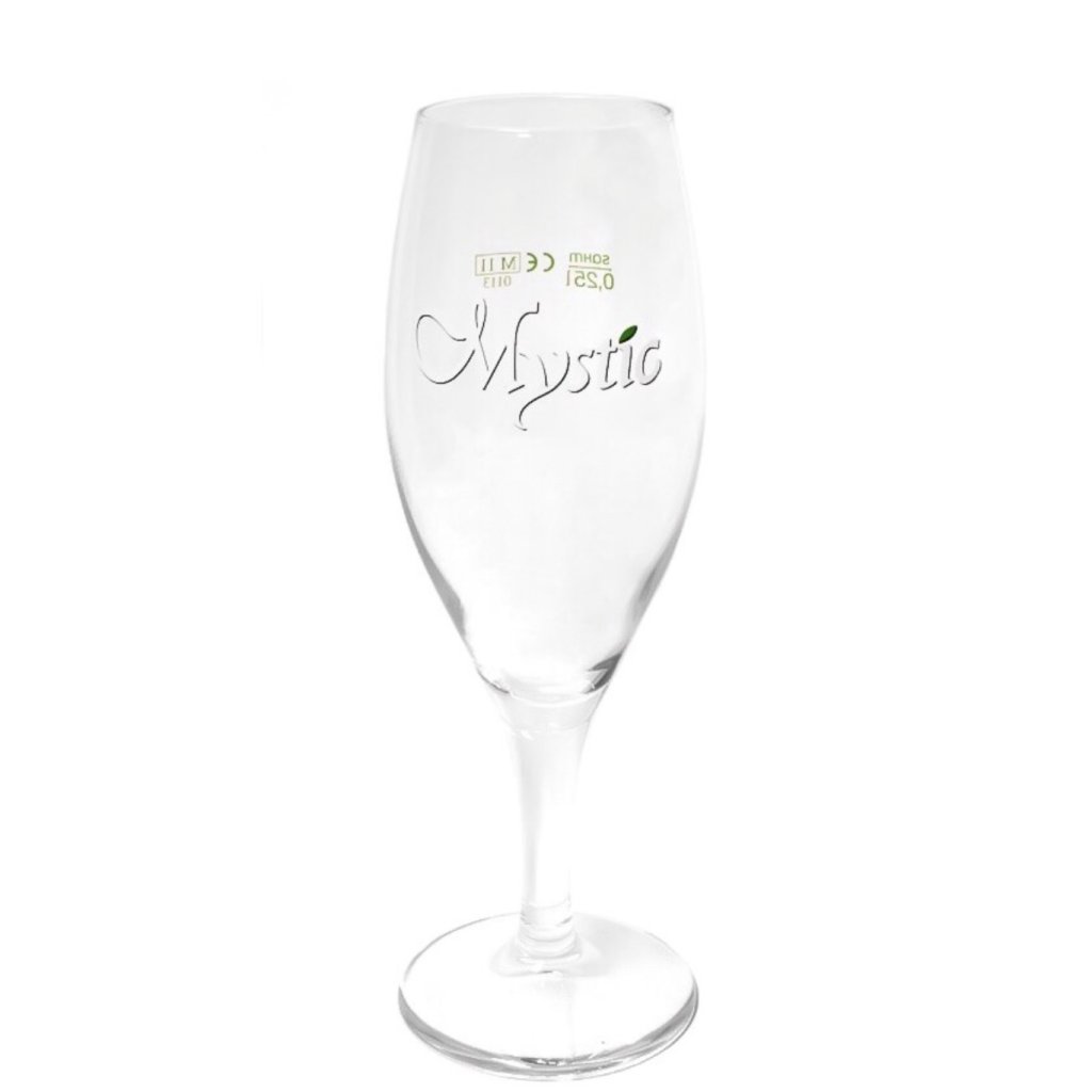 Mystic Bierglas 25 cl. Eine Fruchtbier-Serie aus der Brauerei Haacht in Belgien. Mystic ist ein süßes und erfrischendes Weizenbier, das mit verschiedenen Fruchtsäften aromatisiert ist. Dieses Bierglas ist ein so genanntes „Tulpenglas“ und hat einen relativ langen Körper, einen schmalen Stiel und einen stabilen Fuß. Das Mystic-Logo ist auf der Vorderseite des Glases aufgedruckt.