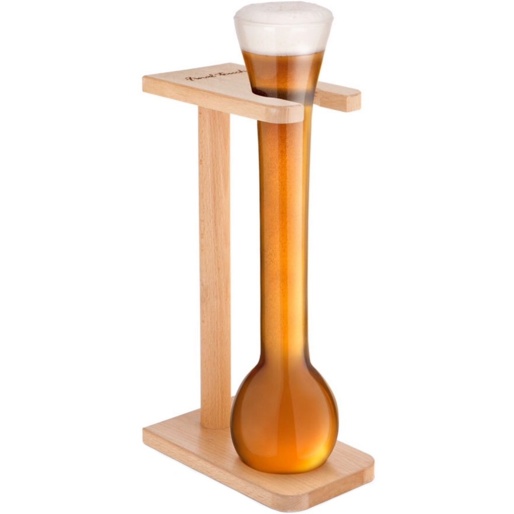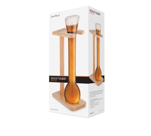 Half Yard Beer ölglas i träställning, 80 cl. Har du problemet att du glömde var du ställde ner glaset? Ingen fara. Yard Beer håller ställningarna! Den moderna klassikern Yard Beer är ett ölglas som kommit fram med utmaningen att dricka en "yard" öl. Ölglaset är mycket smalt och högt, med en utvidgning överst och med helt rund underdel. Det hela vilar i en träställning. Just denna version är då en Half Yard, alltså hälften så stor som originalet.