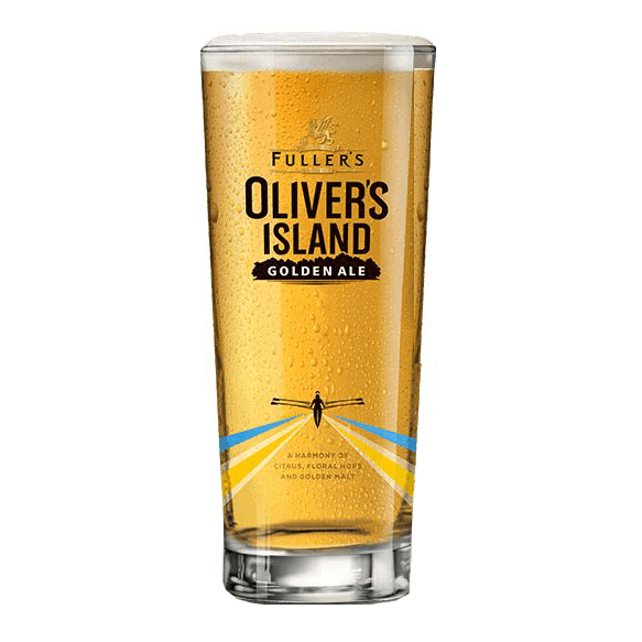 Fullers Oliver Island pint ölglas från Fuller Smith & Turner. Oliver's Island är en skarp, törstsläckande öl som hämtar inspiration från ett lokalt landmärke. Varje dag glider roddare lugnt förbi Griffin Brewery mot ön Oliver's Island i Themsen.