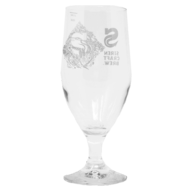 Auf der Vorderseite des Glases sind das Siren-Logo aufgedruckt und auf der Rückseite die Markierung für ein halbes Pint.