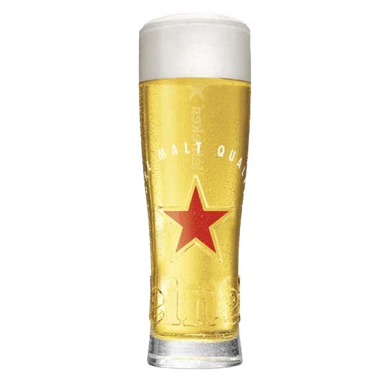 Das Glas ist auf der Vorderseite mit dem bekannten Heineken-Logo versehen, während ein Stern im unteren Bereich der Rückseite ein zusätzliches Detail darstellt, das den ikonischen Look unterstreicht. Die durchdachte Form macht das Glas angenehm zu halten und sorgt für eine ansprechende Präsentation beim Servieren.