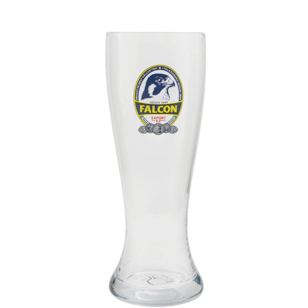 Falcon Bierglas, 50 cl. Hergestellt von einer der traditionsreichen schwedischen Brauereien des späten 19. Jahrhunderts. Dieses Bierglas besticht durch seine elegante, gedrechselte Form und seinen stabilen Boden. Auf der Vorderseite prangt das Falcon-Logo mit dem klassischen Falken.