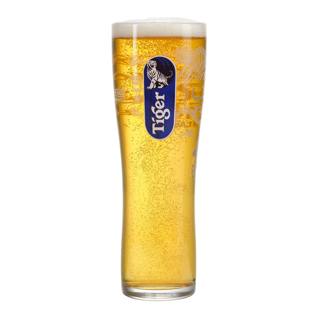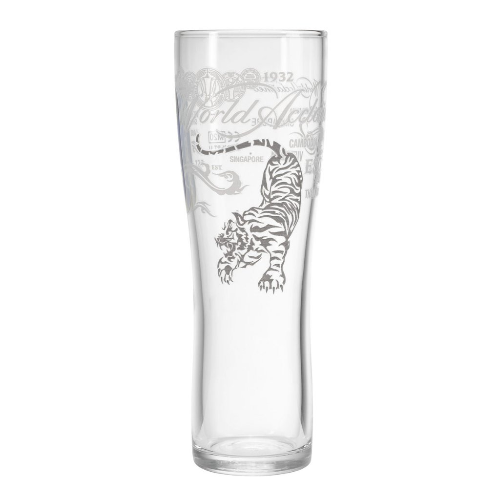 Tiger Beer Bierglas 2/3-Pint (ca. 37 cl) für eines der berühmtesten Biere Asiens. Das Tiger Beer mit seinem leicht blumigen Aroma und seinem frischen Geschmack mit ausgewogener Bitterkeit hat viele internationale Auszeichnungen erhalten. Ein scharfes und erfrischendes Lagerbier, das sich sowohl für gesellige Runden als auch zum Essen eignet. Das Bierglas ist mit einem eleganten, mattierten Tiger bedeckt, der von Texten und Ortsnamen umgeben ist, die ein Gefühl des fernen Südostasiens vermitteln. Das Tiger-Beer-Logo ist ebenfalls in Blau aufgedruckt.