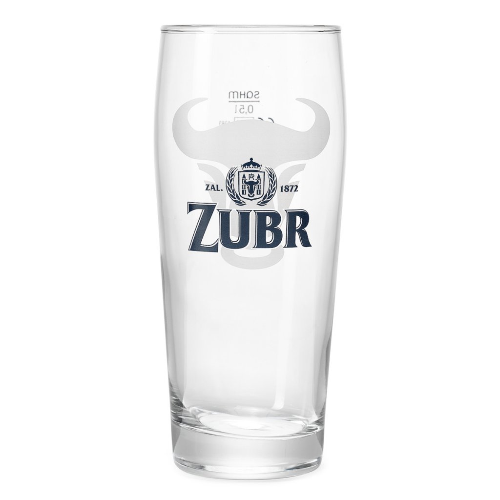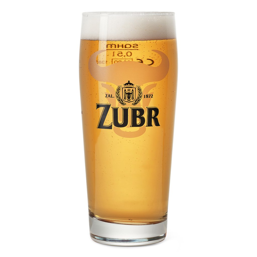 Zubr Bierglas 50 cl. Ein nordtschechisches Bier mit stilvoller Ausgewogenheit. Der Name Zubr stammt vom tschechischen Namen des Wisents, der auf dem Familienwappen der Gründer zu sehen war. Dieses Bierglas hat gerade Linien und einen schweren Boden. Das Zubr-Logo ist auf der Vorderseite zusammen mit einem mattierten Stier aufgedruckt.