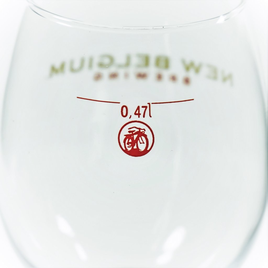 New Belgium Ölglas 47 cl. Ett av de mest framstående bryggerierna från den amerikanska hantverksölrörelsen. New Belgium i Fort Collins, Colorado, har sedan sin lansering i Sverige bjudit på förstklassiga öl med både amerikanska och, som namnet antyder, belgiska influenser. Detta ölglas är en vacker kupa på en stabil fot och stjälk. New Belgiums logga är tryckt i guld och rött på framsidan och på baksidan finns en liten bild av den modellen cyklar som alla anställda på New Belgium får som välkomstpresent.