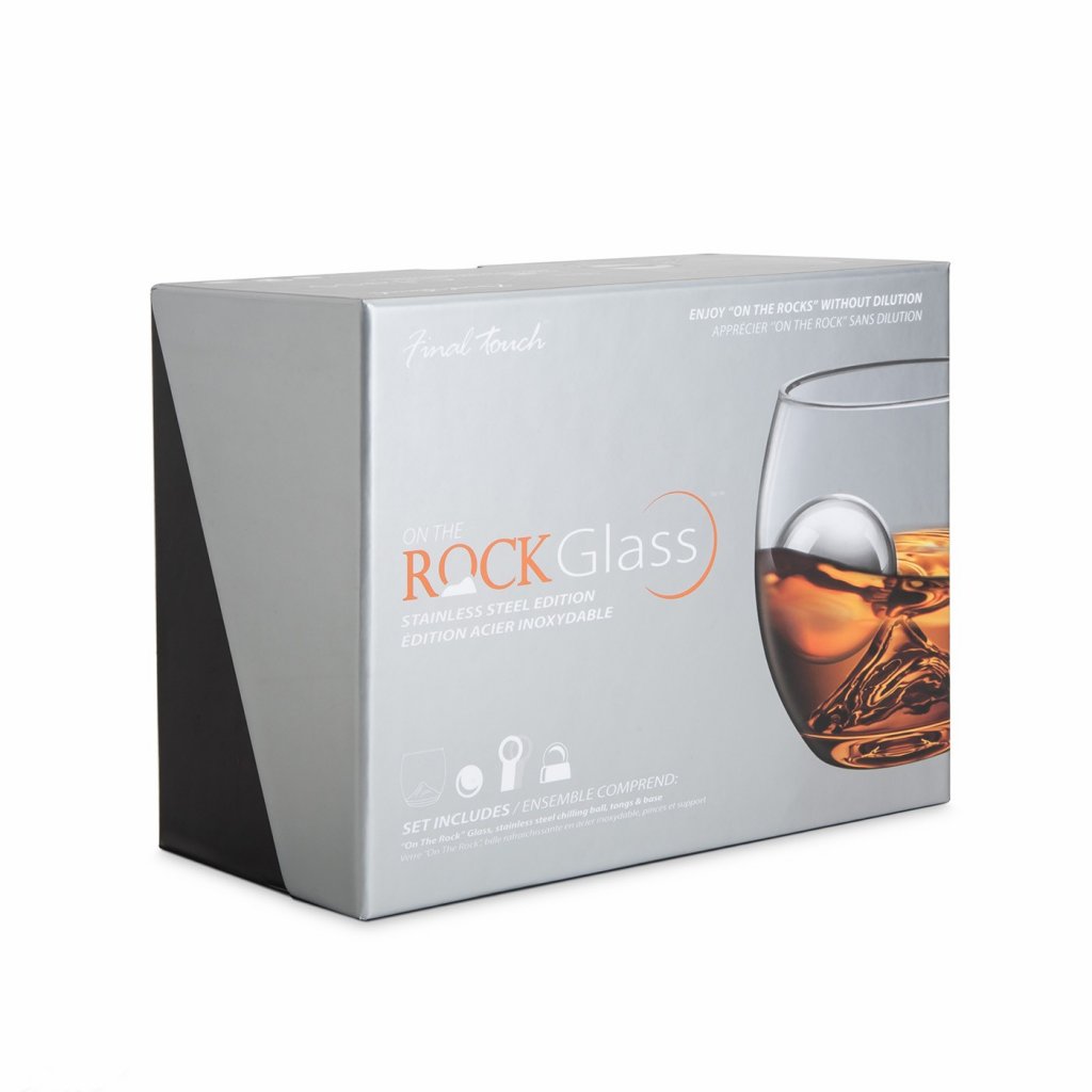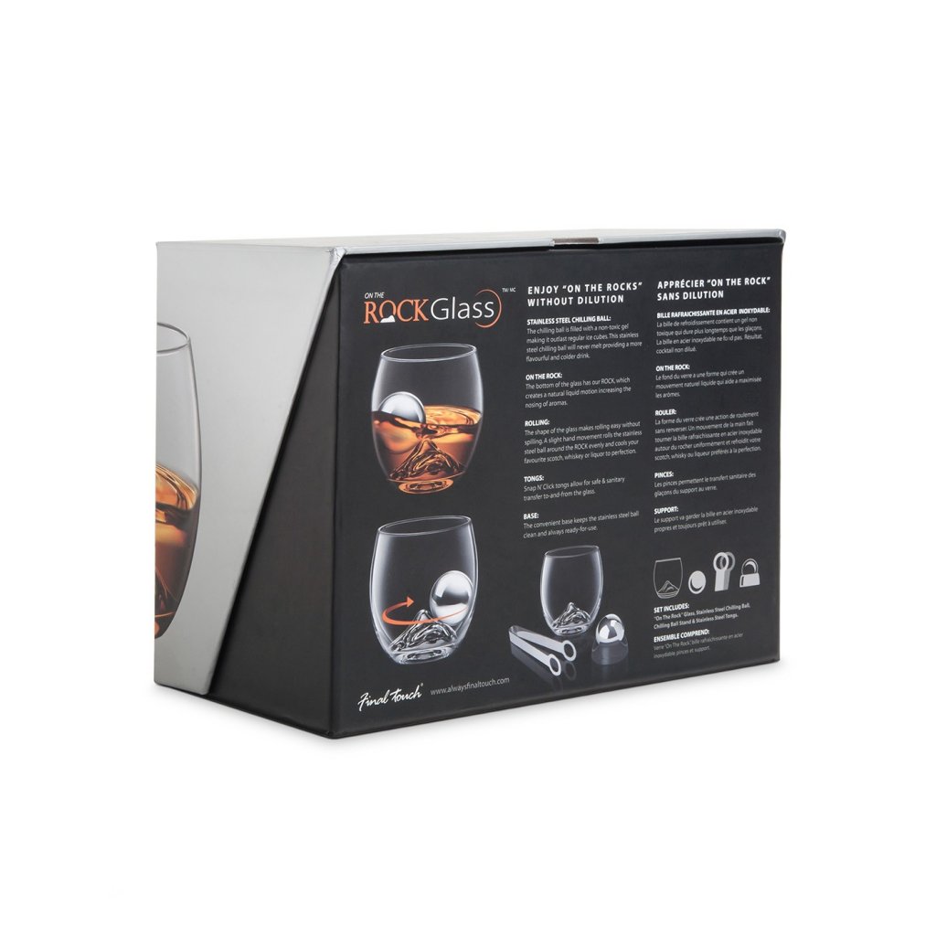 Final Touch On The Rocks glas presentpaket. En perfekt present att ge bort till livsnjutaren. Detta stiliga presentpaket innehåller det rosade On The Rocks-glaset med en upphöjning i botten som liknar en bergstopp, en specialanpassad frysboll och en istång i metall. Komplett set för att till fullo kunna avnjuta en whisky i lugn och ro. Formationen i botten på glaset gör att den effektiva frysbollen rullar runt i glaset på ett angenämt sätt utan att späda ut drycken. Istången gör det enkelt för dig att både applicera och ta ur isbollen utan att spilla.