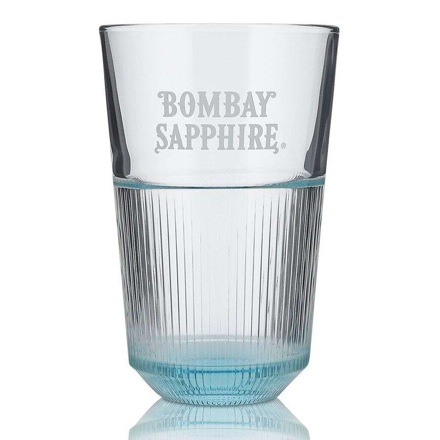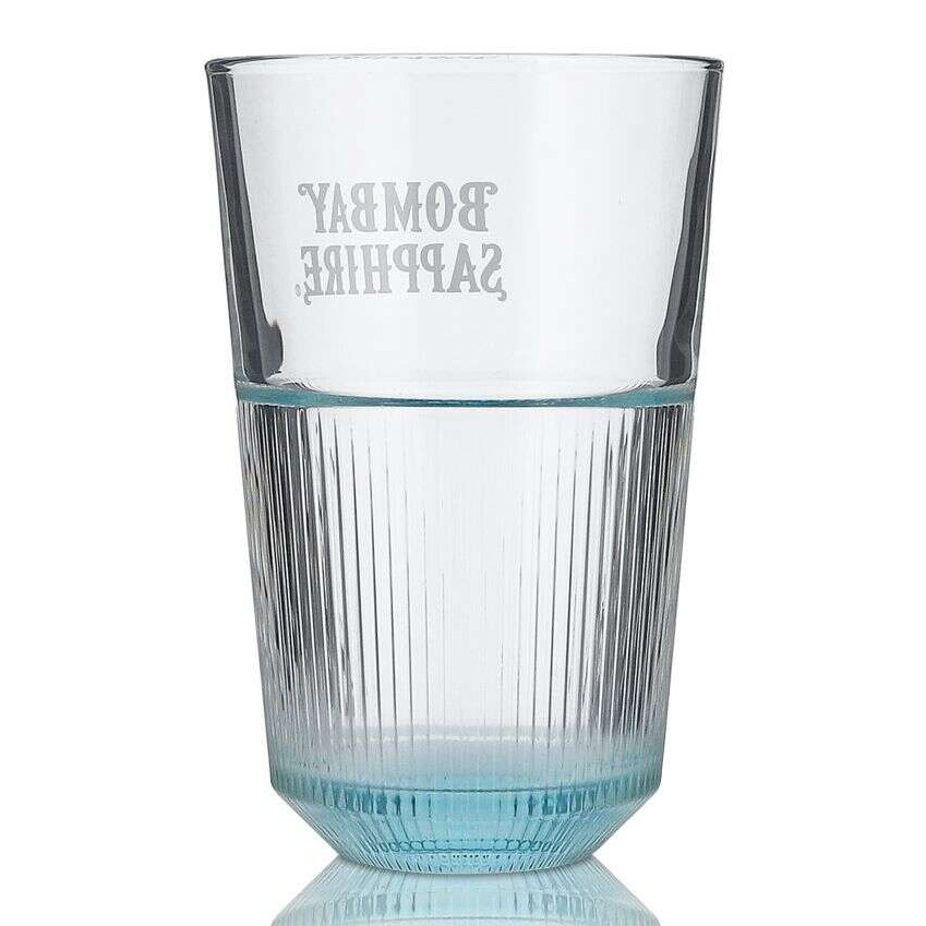 Bombay Sapphire Highballglas, ideal zum Mixen und Servieren eines klassischen Gin & Tonic mit einem zeitlosen, eleganten Gefühl. Dieses Trinkglas besitzt eine stilvolle geriffelte Kontur am Boden, die in eine runde Form übergeht.