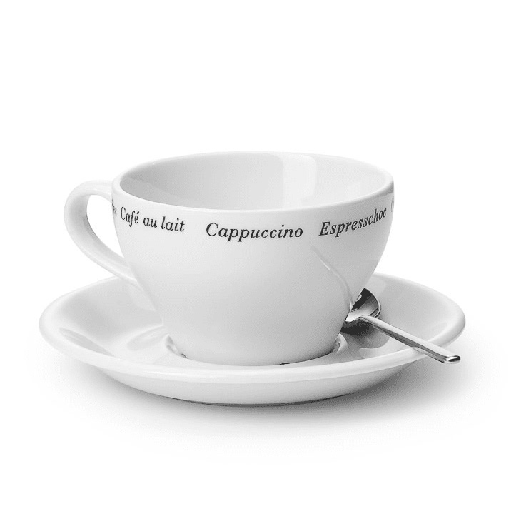 Die elegante schwarze Schrift – Coffee, Café au lait, Cappuccino, Espresschoc, Chocolate, Chocomilk – verleiht eine raffinierte Note, die sowohl für den Heimgebrauch als auch für professionelle Umgebungen geeignet ist. Die Tasse und die Untertasse sind perfekt für den Genuss von klassischem Cappuccino bis hin zu cremiger Schokolade, und ihre langlebige Konstruktion macht sie ebenso praktisch wie schön.