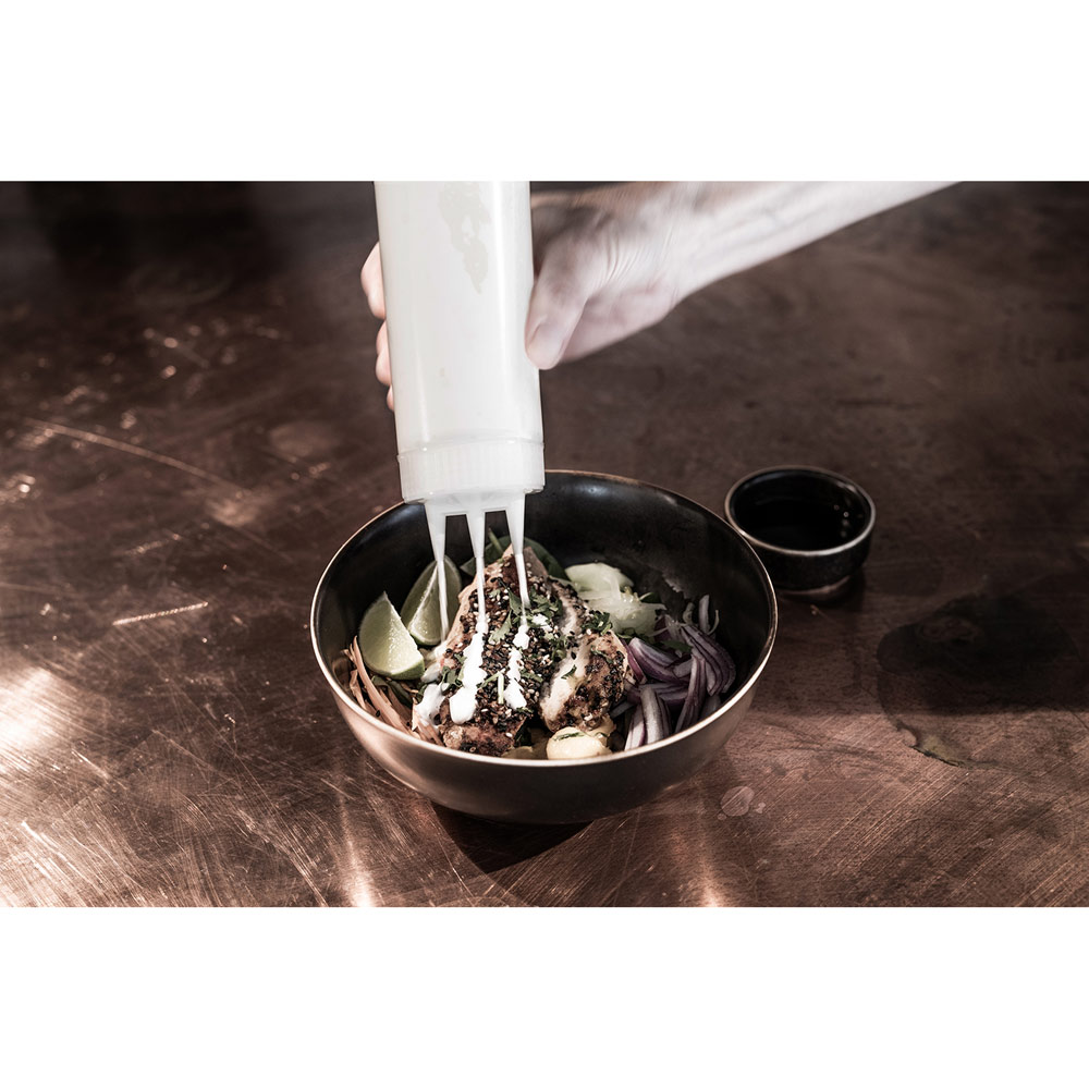 Dressingflasche durchsichtig 34 cl aus transparentem Kunststoff mit 3 Ausgießern. Ideal für die Verwendung mit fertigen Getränkemischungen und Fruchtpürees. Praktisch in der Anwendung und leicht zu reinigen.