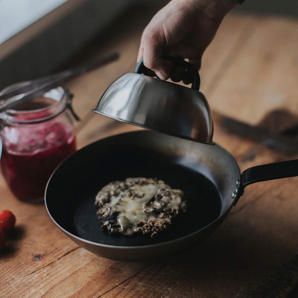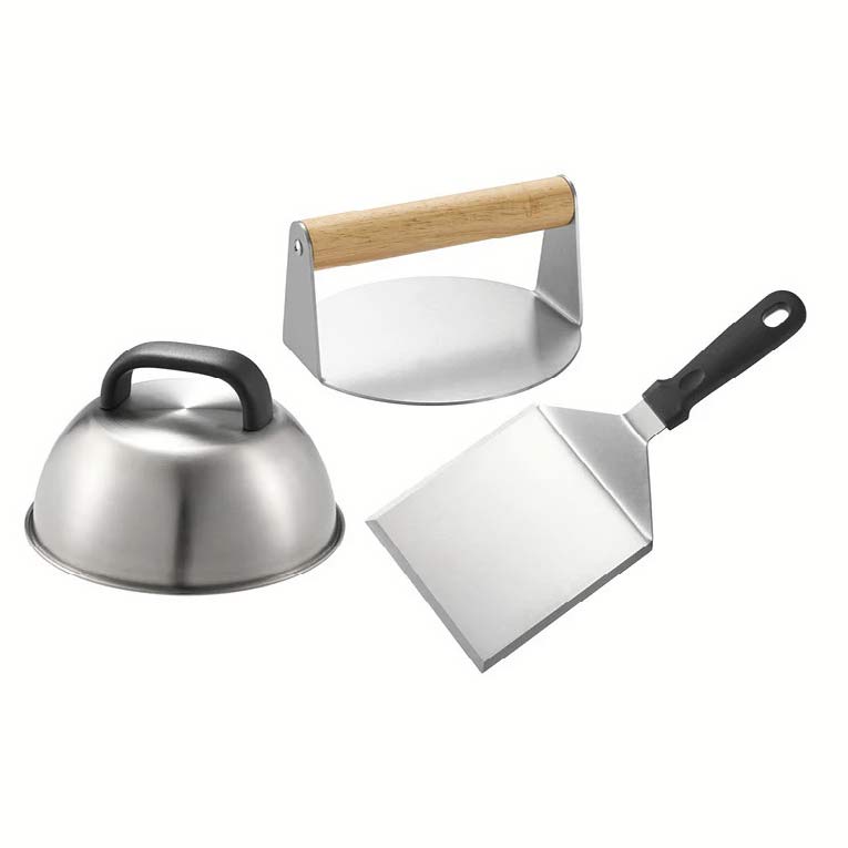 Das Set enthält einen Smasher, einen Pfannenwender und einen Deckel, die effektiv zusammenarbeiten: Der Smasher presst das Fleisch gleichmäßig für eine optimale Bratfläche, der Pfannenwender erleichtert das Wenden und Handhaben des Burgers, und der Deckel hält die Hitze und schmilzt den Käse perfekt. Das Ergebnis? Schnellere Zubereitung, besserer Geschmack und ein professionelles Ergebnis zu Hause.