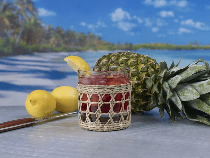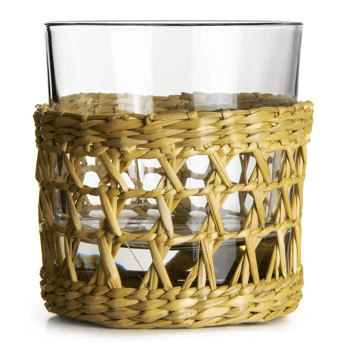 Urban Bar Gili Old Fashioned Glas 30 cl mit einer dekorativen Hülle aus 100 % natürlichem, umweltfreundlichem Seegras, das von Hand gewebt wird. Ein Tumbler-Glas, das sich ideal zum Servieren von Whiskey und anderen Getränken eignet.