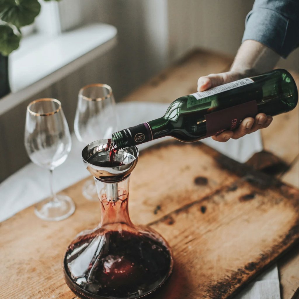 Mit einem eingebauten Sieb fängt Valu jedes Sediment effektiv auf, sodass Sie jedes Mal ein klares und belüftetes Glas Wein genießen können. Das robuste und stilvolle Design macht es nicht nur zu einem praktischen Werkzeug, sondern auch zu einem raffinierten Detail auf Ihrem Esstisch.