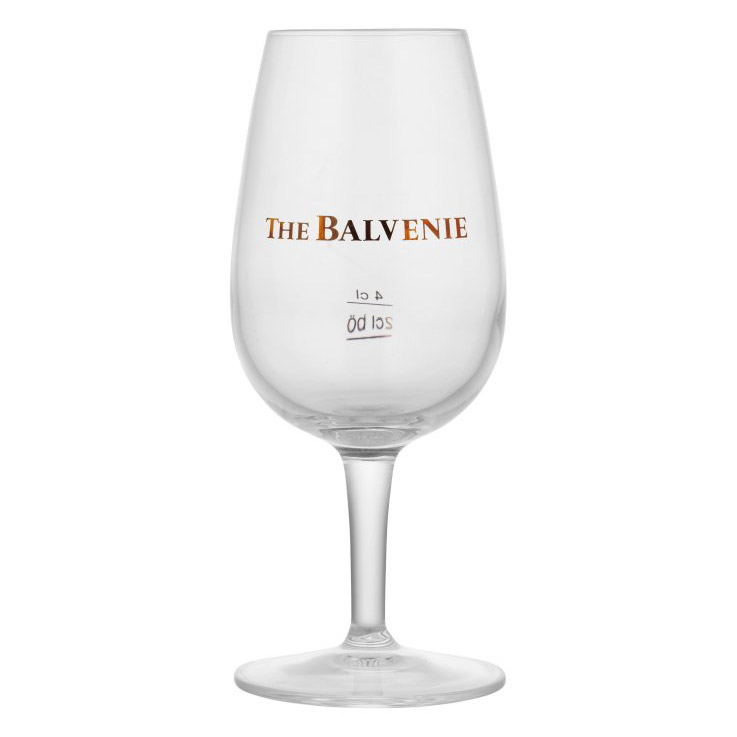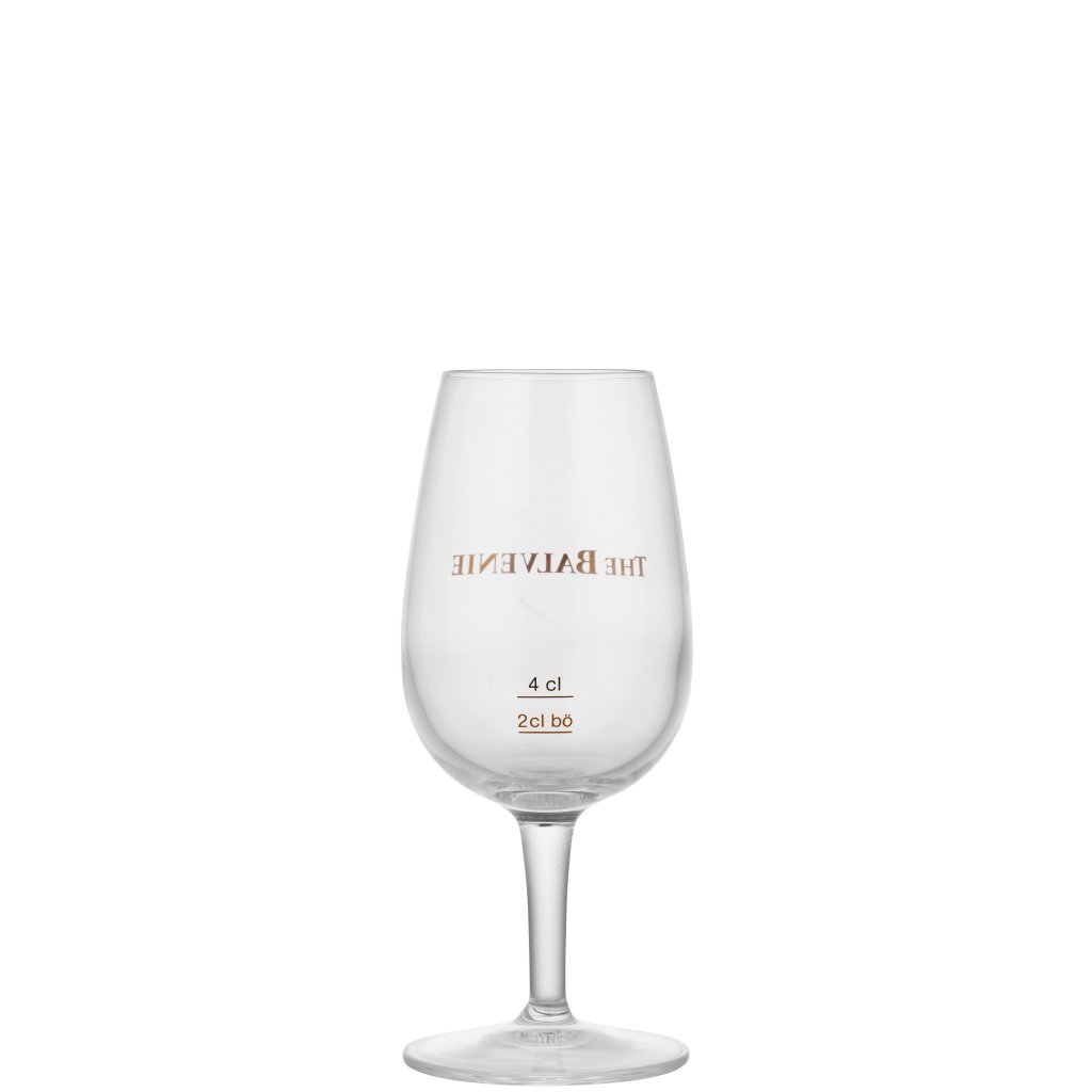 Balvenie whiskyglas. Mitt i vad som ibland kallas whiskyns huvudstad, Dufftown, ligger destilleriet Balvenie. Bland myriaderna av whiskyproducenter lyckas The Balvenie stå ut, bland annat på grund av sin unika golvmältning och det rena vattnet från källan Robbie Dhu springs, som även delas med draken Glenfiddich. Detta eleganta whiskyglas vilar på fot och har en delikat liten kupa som förstärker aromerna. På framsidan står The Balvenie tryckt i brons, och på baksidan återfinns markeringar vid 2, och 4 cl.